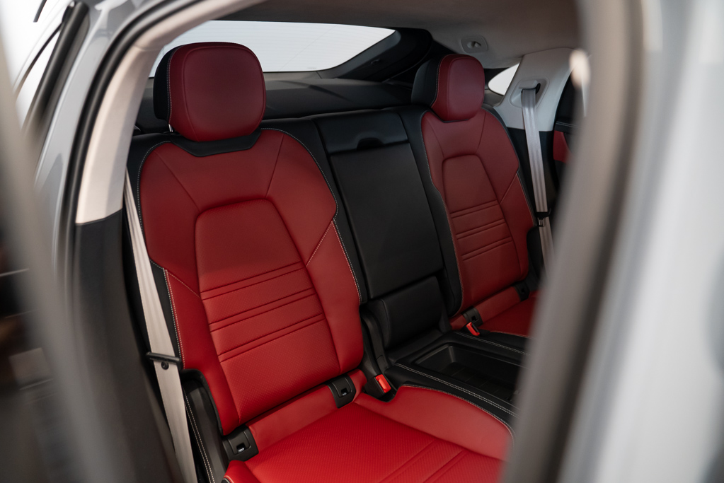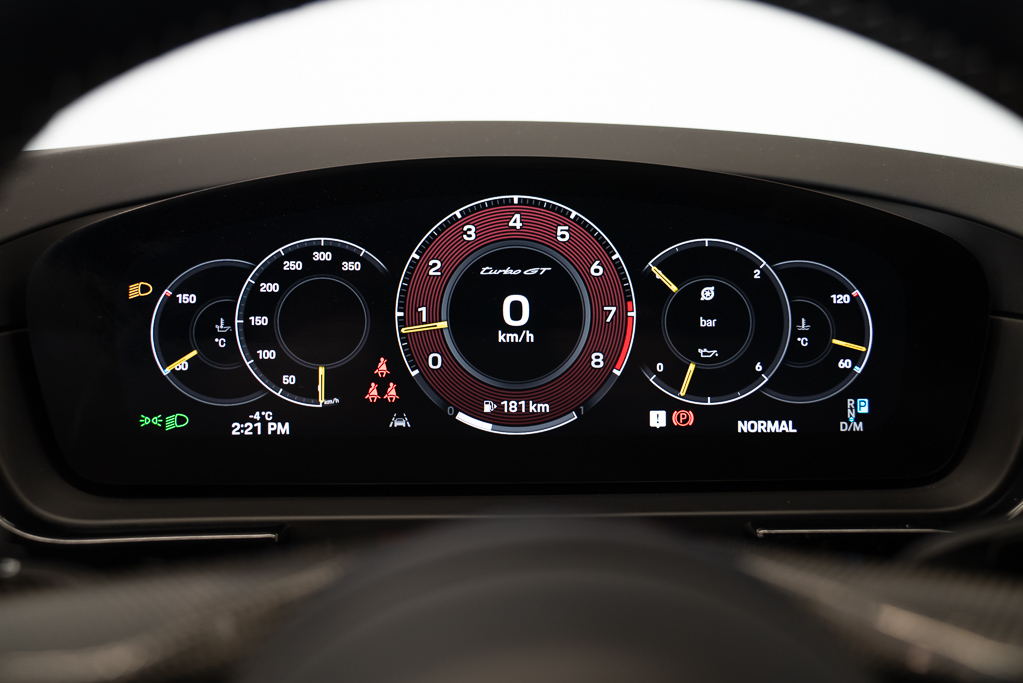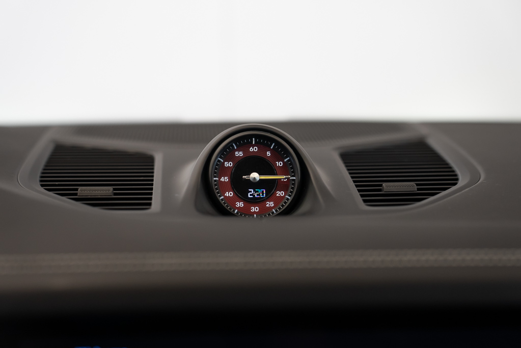 Garniture intérieure -comprend : garniture de tableau de bord en fibre de carbone, applique de panneau de porte en fibre de carbone, applique de console noir piano, contrastes intérieurs noir piano/d'aspect métallique et tableau de bord rembourré en suédine