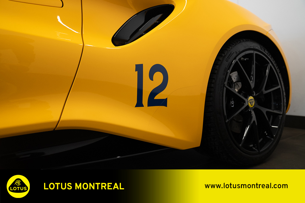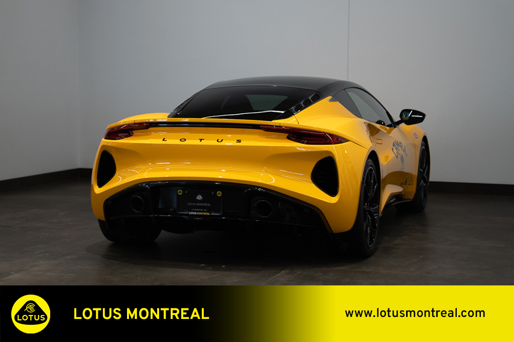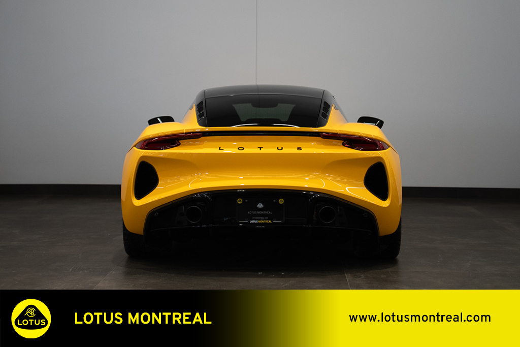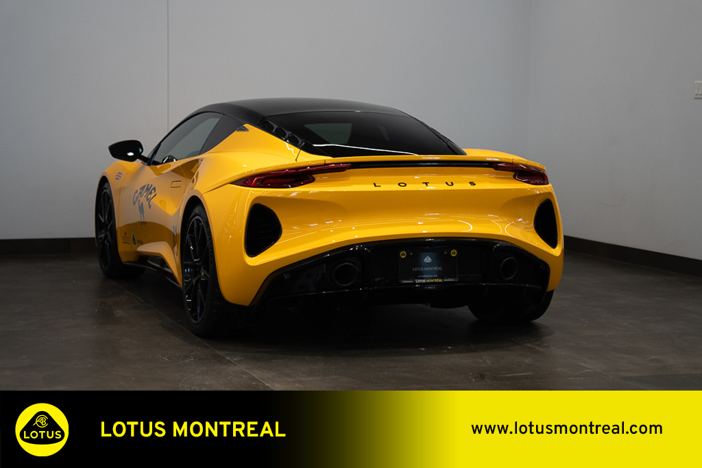 Option list: 8-Speed dual clutch automatic gearbox, Full Black pack *Black rear tailpipe, Gloss black cant rails, Gloss black mirror backs, Gloss black roof panel, Lower black pack*, Premium Black leather steering wheel w/ yellow stitching and TDC, 20 inch gloss black forged V-spoke wheel, Michelin pilot sport cup 2 tires, Brake caliper color - Yellow, Sport suspension. Normal Tint Windows, Lotus Full Front + Rockers PPF