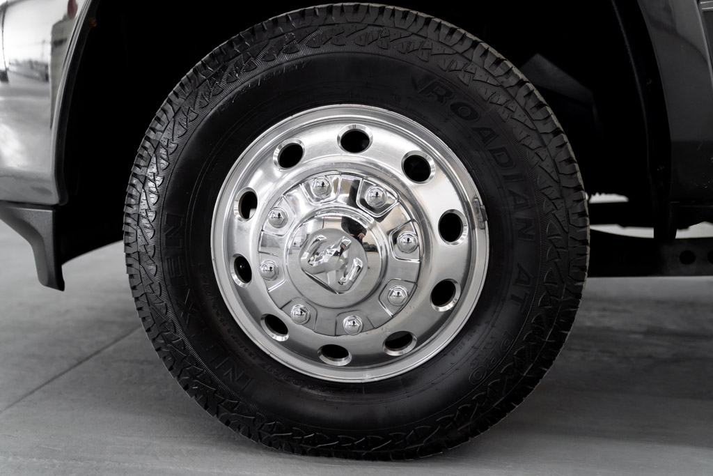 pneu de secours pleine grandeur rangé au soubassement avec manivelle